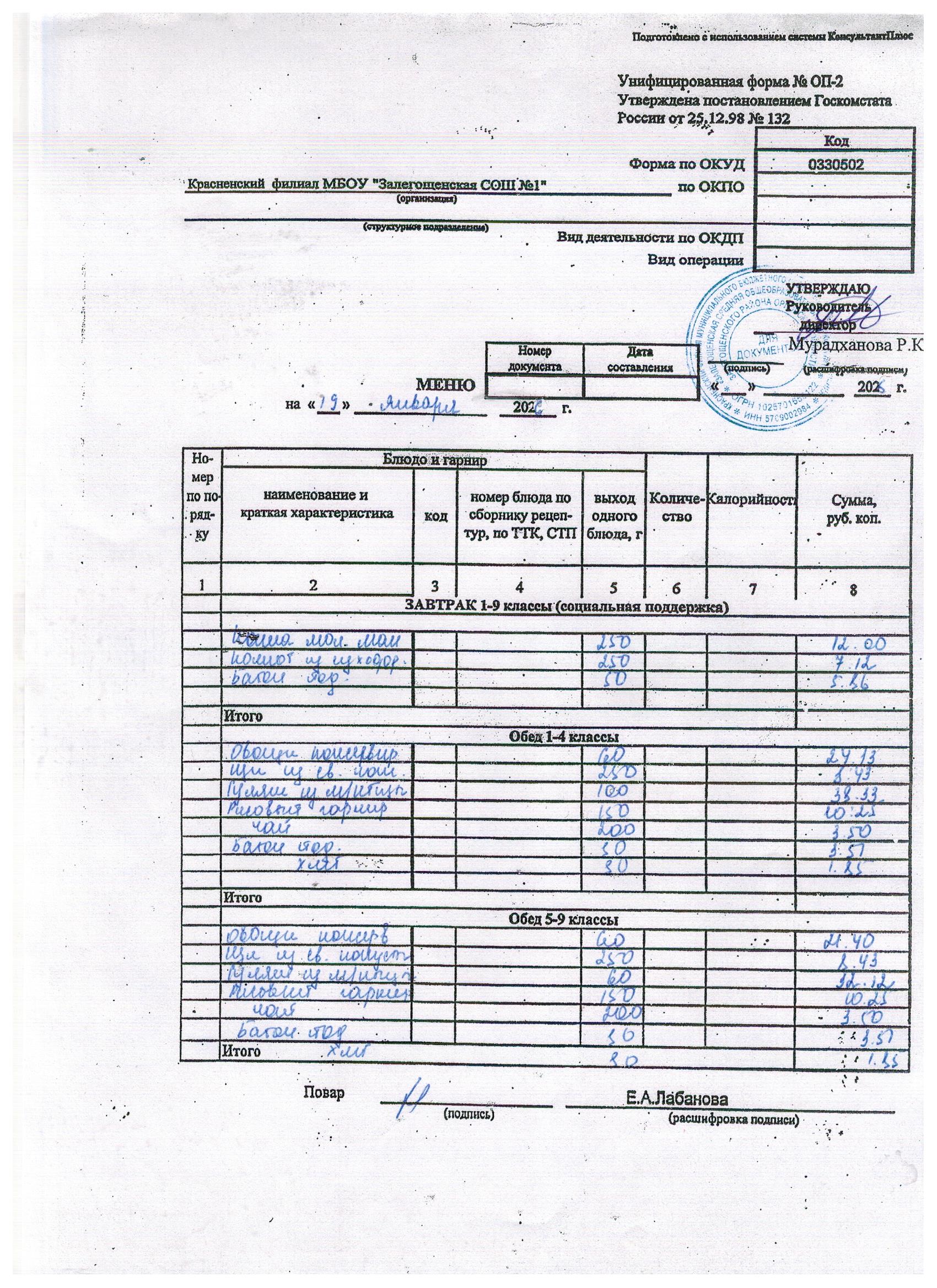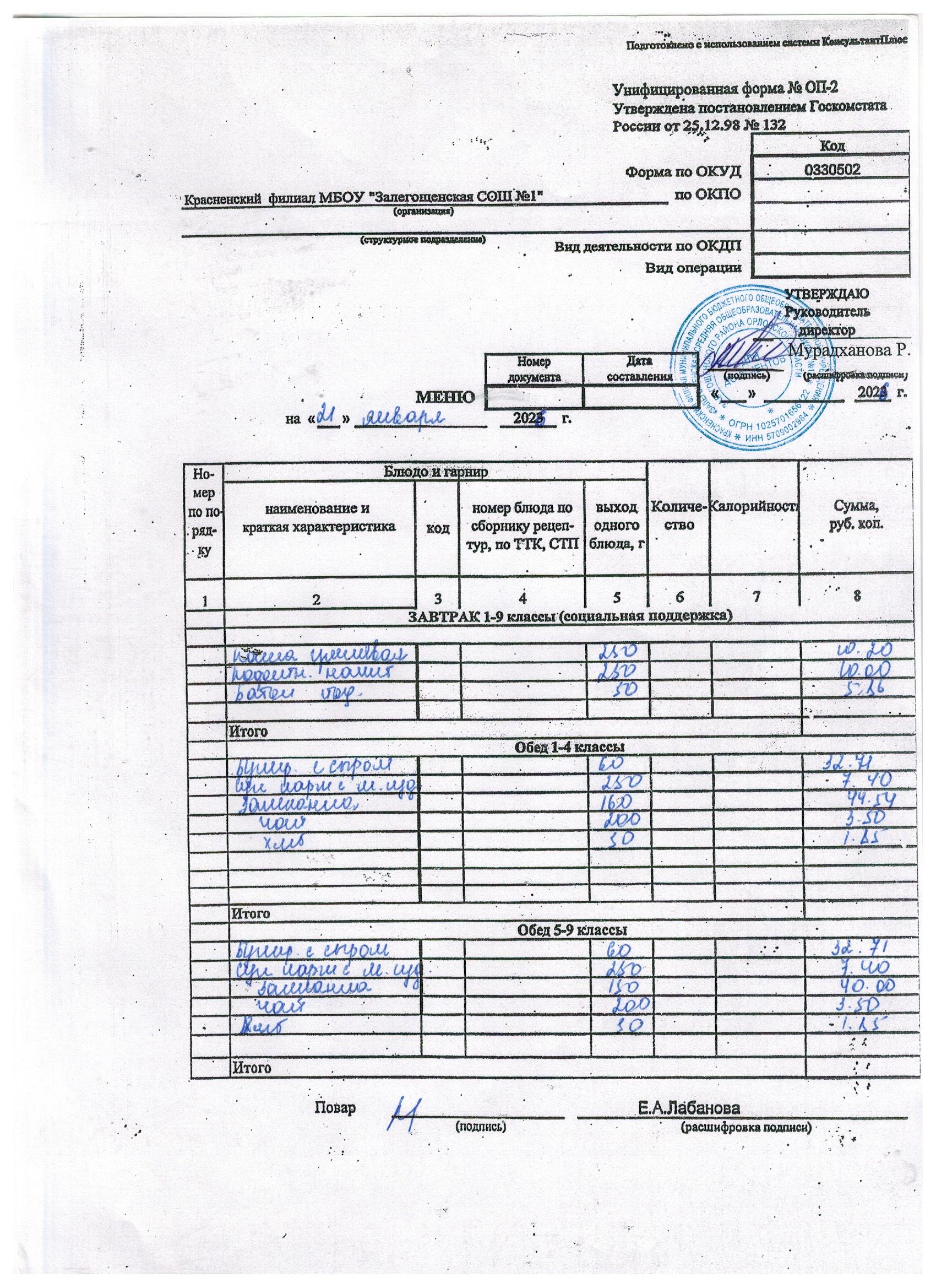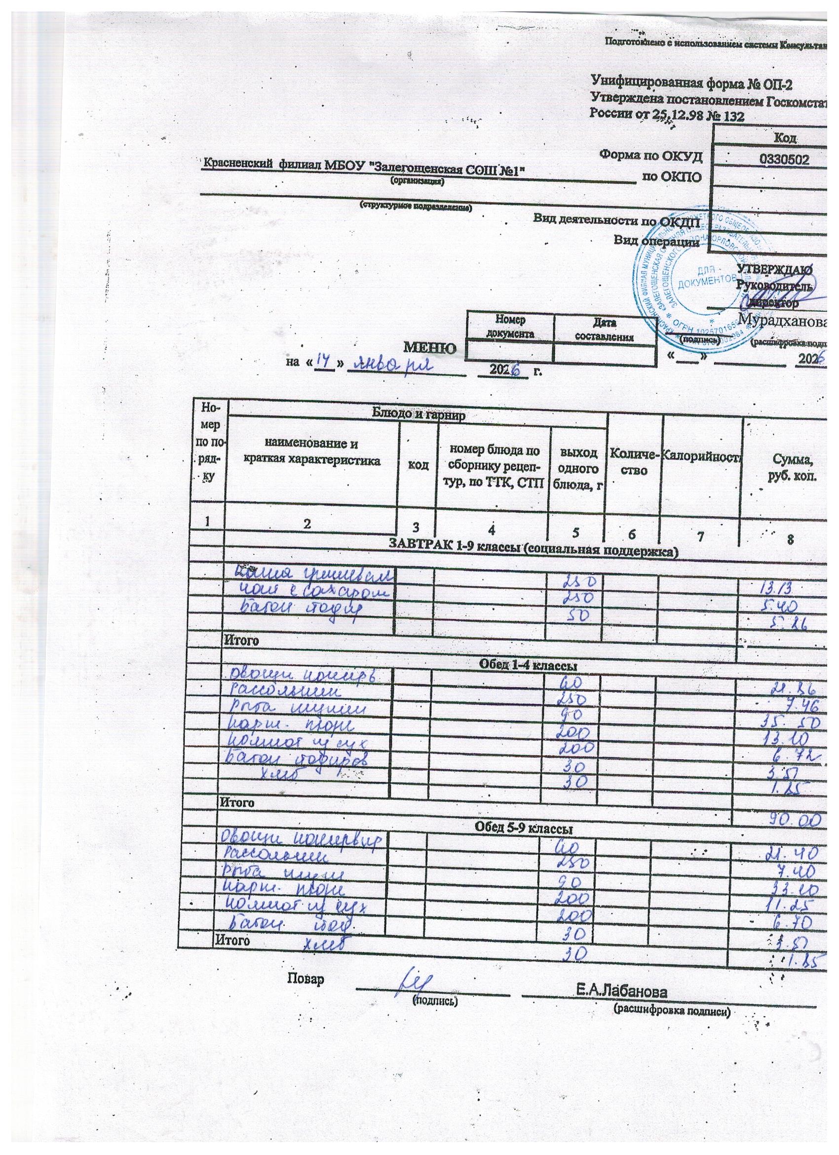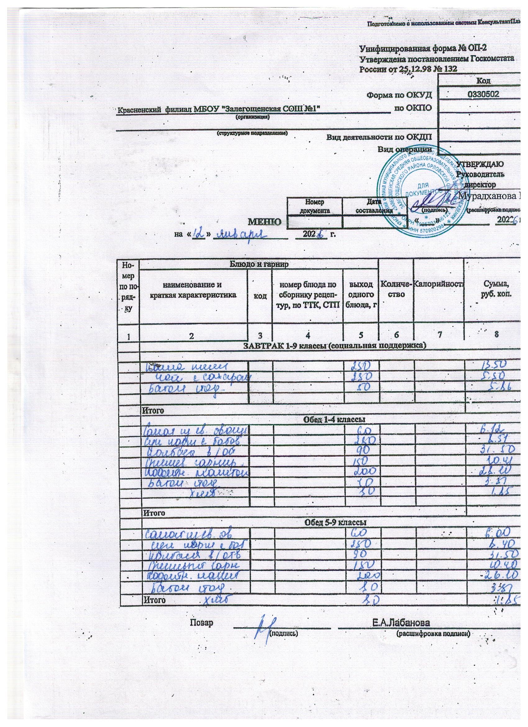 Ежедневное меню на январь 2026г